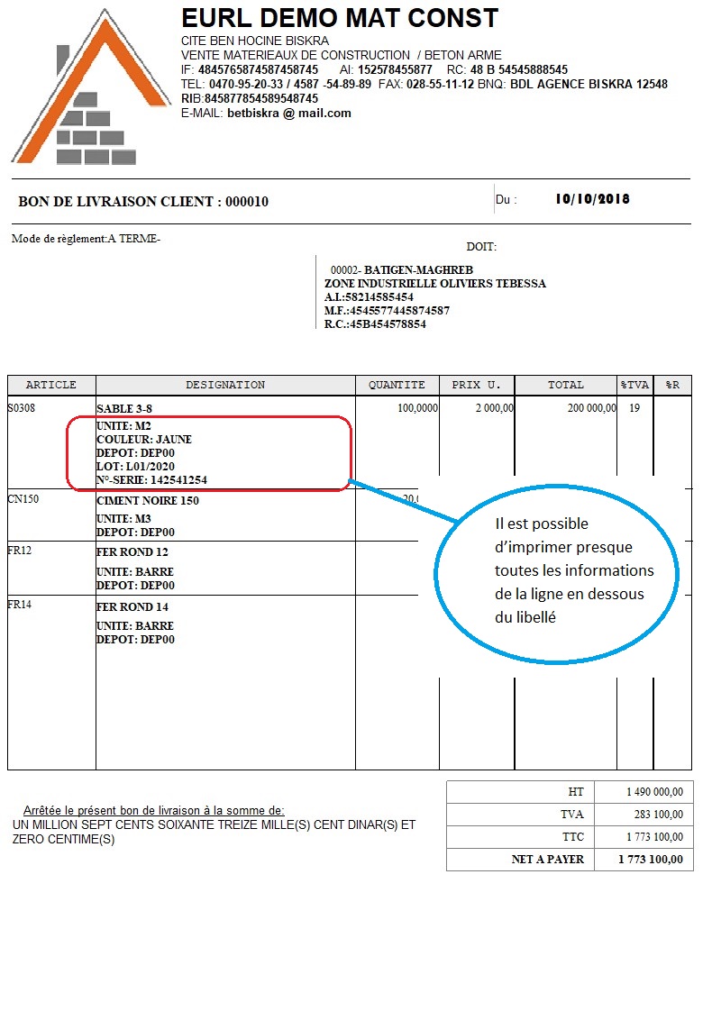 ==> Au lieu d'utiliser plusieurs colonnes ; il est possible d'imprimer des informations en dessous du LIBELLEde l'ARTICLE. Voir un aperçu Ici. Pour paramétrer les informations à imprimer en dessous du LIBELLE ARTICLE voir Ici